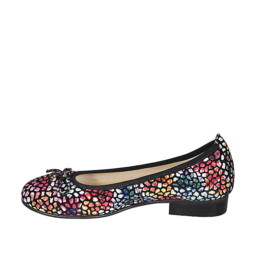 Runder Damenballerinaschuh aus buntem mosaikgedrucktem Wildleder mit Schleife Absatz 2