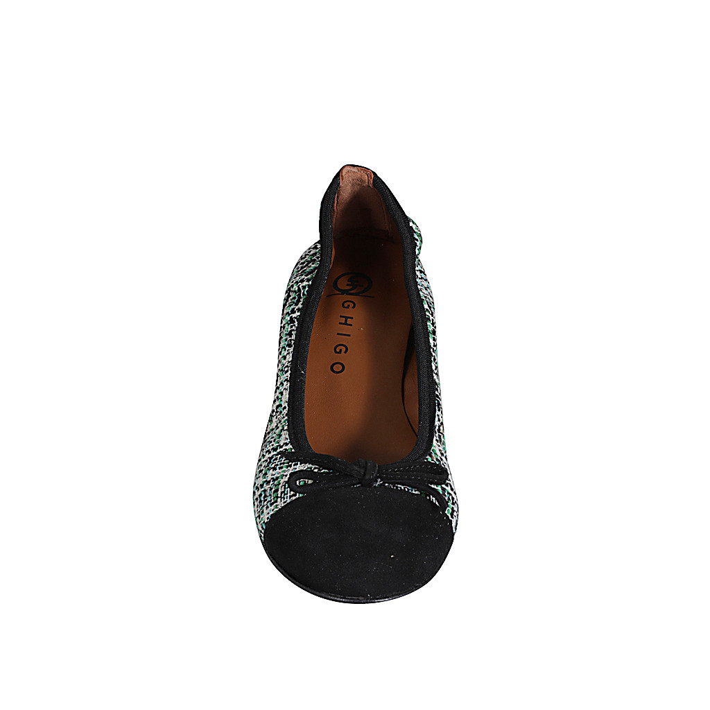 Ballerinaschuh für Damen aus schwarzem Wildleder und buntem Stoff mit Kappe und Schleife Absatz 4
