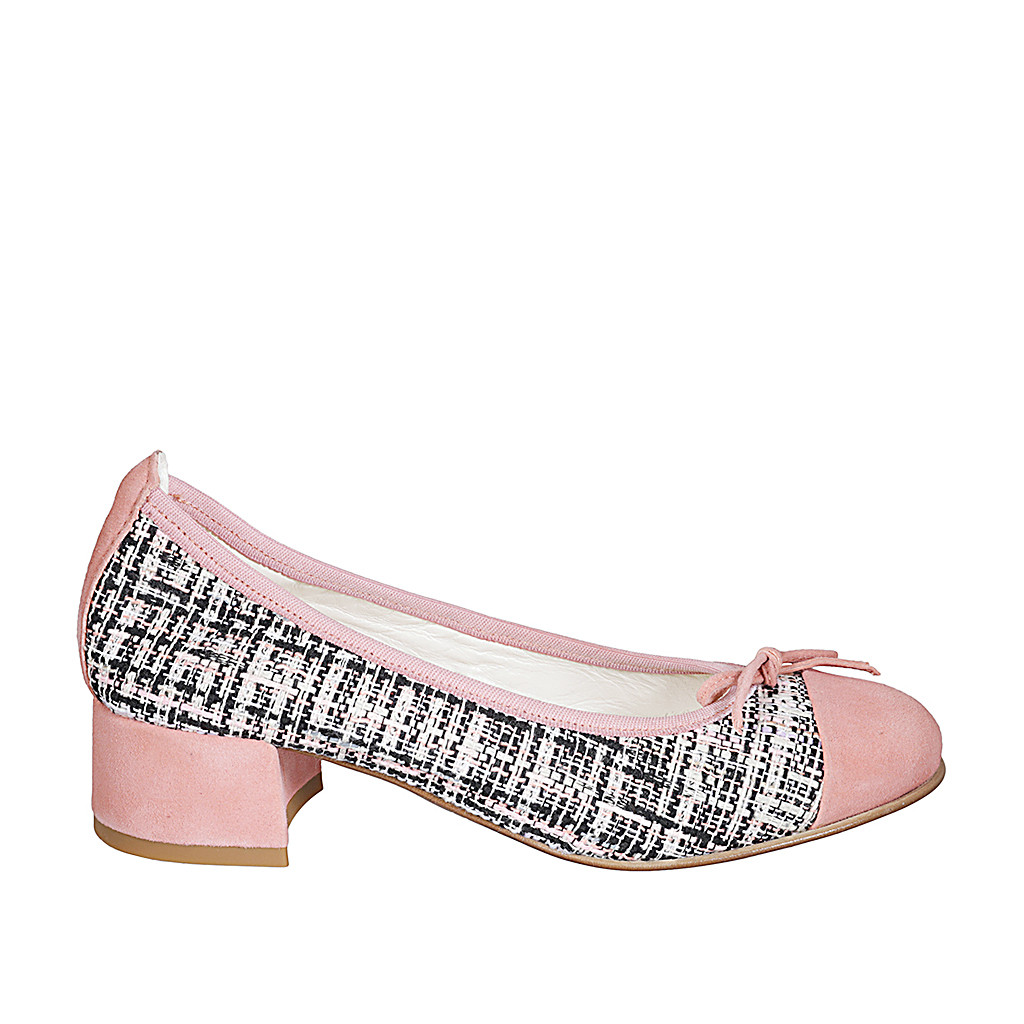 Ballerinaschuh für Damen aus rosafarbenem Wildleder und buntem Stoff mit Kappe und Schleife Absatz 4