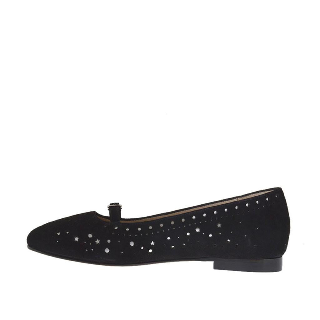 Damenballerinaschuh mit Riem aus schwarzem perforiertem Wildleder und silberfarbenem laminiertem Leder Absatz 1 - Verfügbare Größen:  32