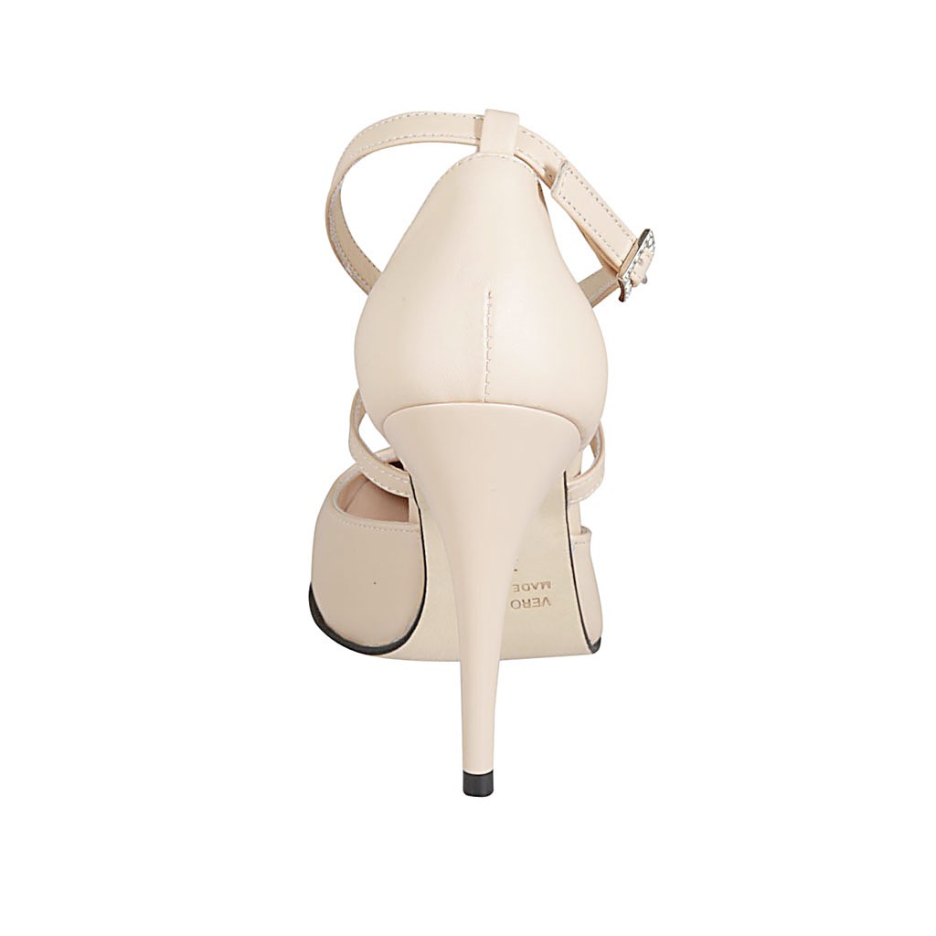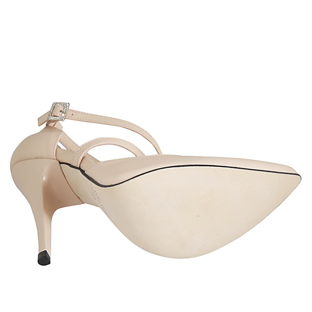 Offener spitzer Damenschuh mit Riem aus rosafarbenem Leder und hellrosafarbenem Lackleder Absatz 8