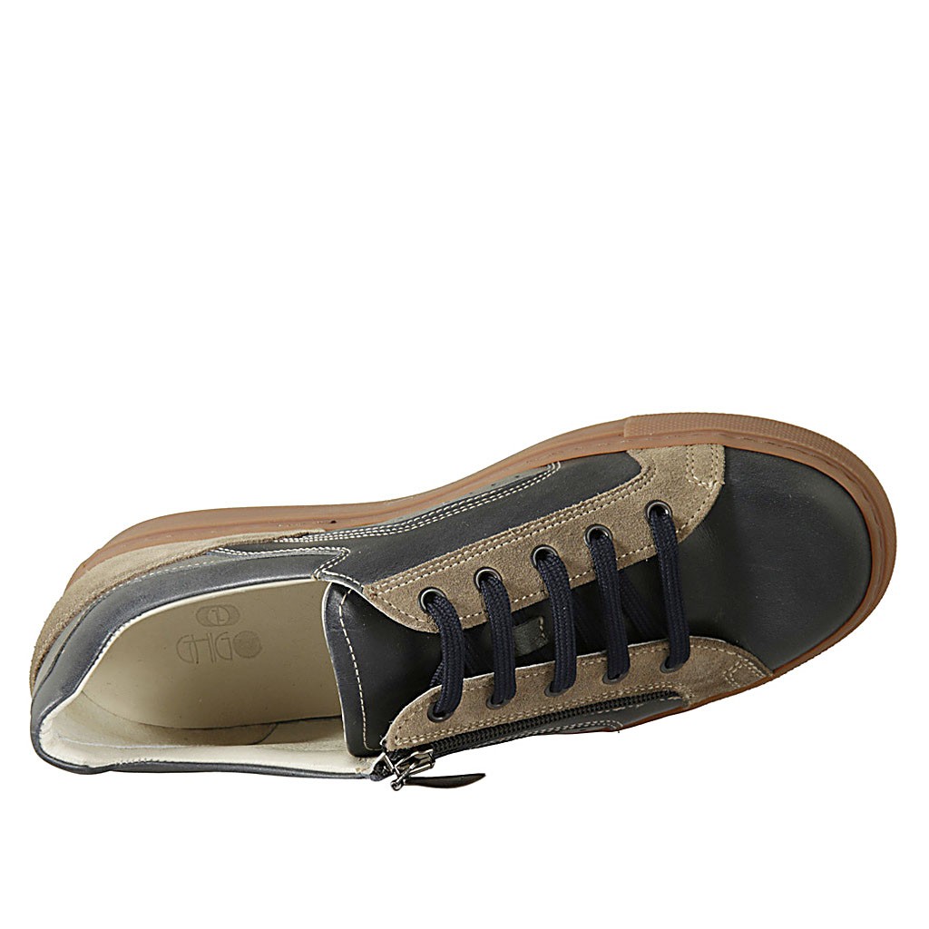 Herrenschnürschuh mit Reissverschluss und abnehmbarer Innensohle aus blaugrauem Leder und taupefarbenem Wildleder - Verfügbare Größen:  37, 46, 47, 48, 50