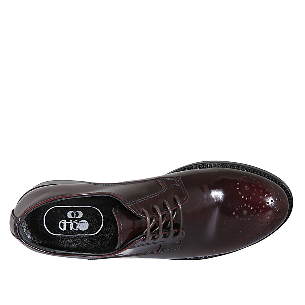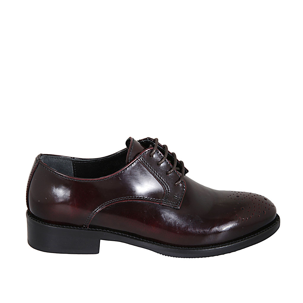Damenderbyschuh mit Schnürsenkeln aus bordeauxfarbenem gebürstetem Leder mit Broguemuster Absatz 3