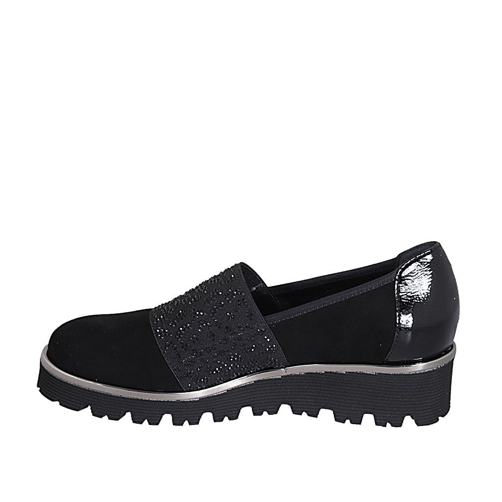 Damenschuh mit Gummiband und Strasssteinen aus schwarzem Wildleder und Lackleder Keilabsatz 4