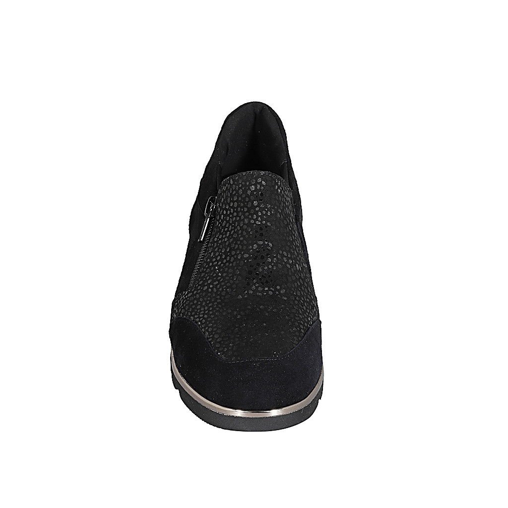 Damenschuh mit Reißverschlüssen und abnehmbarer Innensohle aus schwarzem laminiertem bedrucktem Wildleder Keilabsatz 3