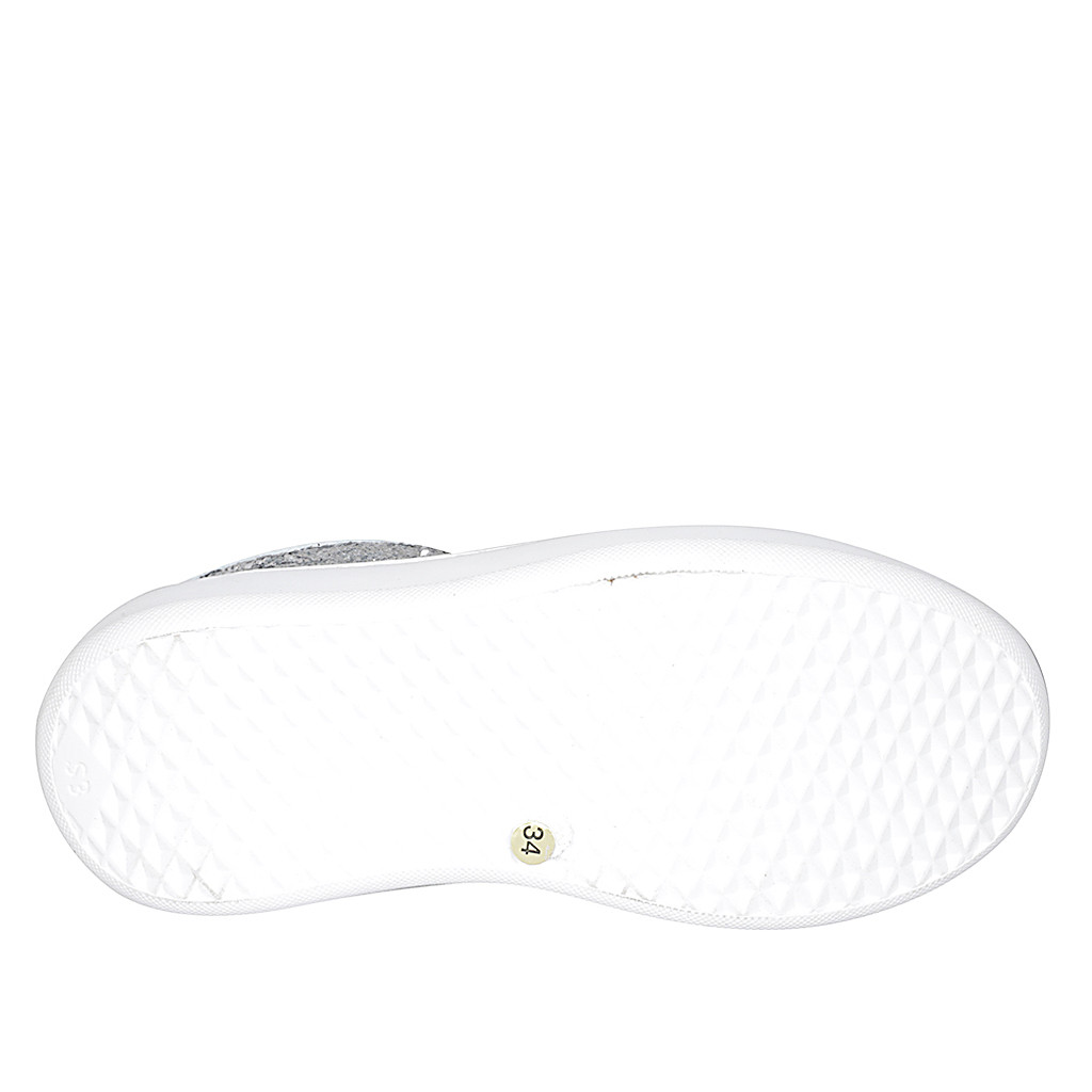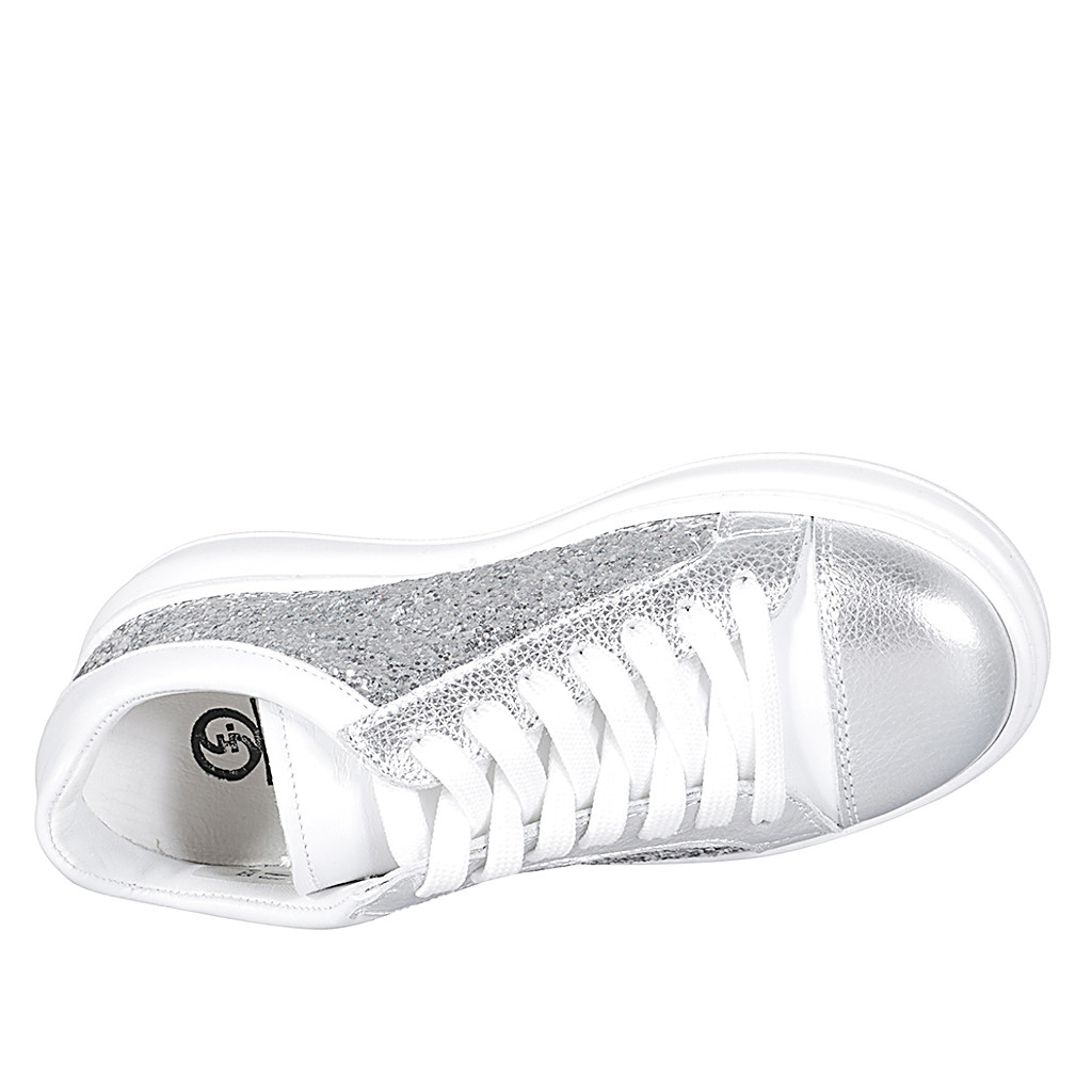 Schnürschuh mit abnehmbarer Innensohle aus weißem und silberlaminiertem Leder mit Glitter Keilabsatz 4