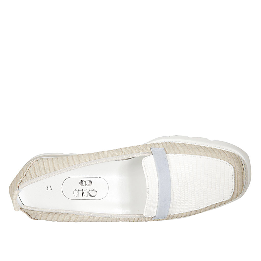 Damenmokassin aus weißem und beigem bedrucktem Leder und hellblauem Wildleder Keilabsatz 3