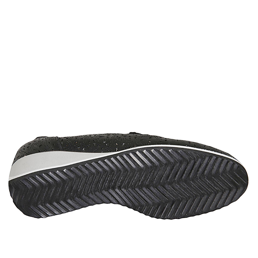 Damenmokassin mit herausnehmbarer Innensohle und Gummibändern aus schwarzem bedrucktem Leder Keilabsatz 3