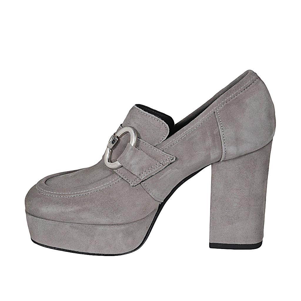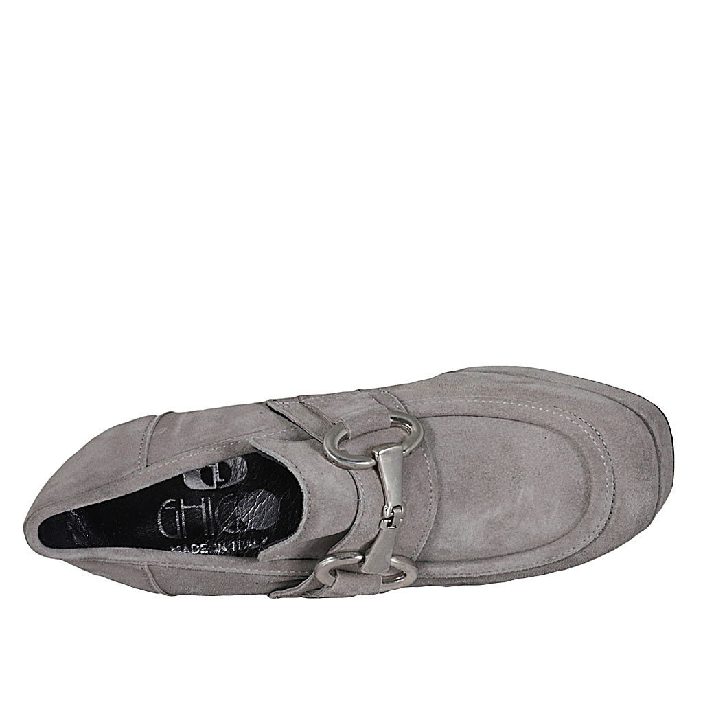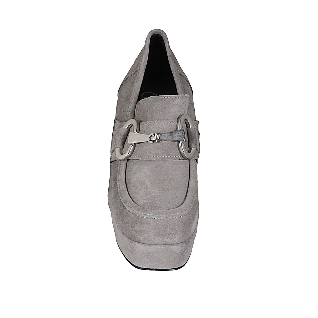 Damenmokassin mit Plateau und Accessoire aus grauem Wildleder Absatz 10