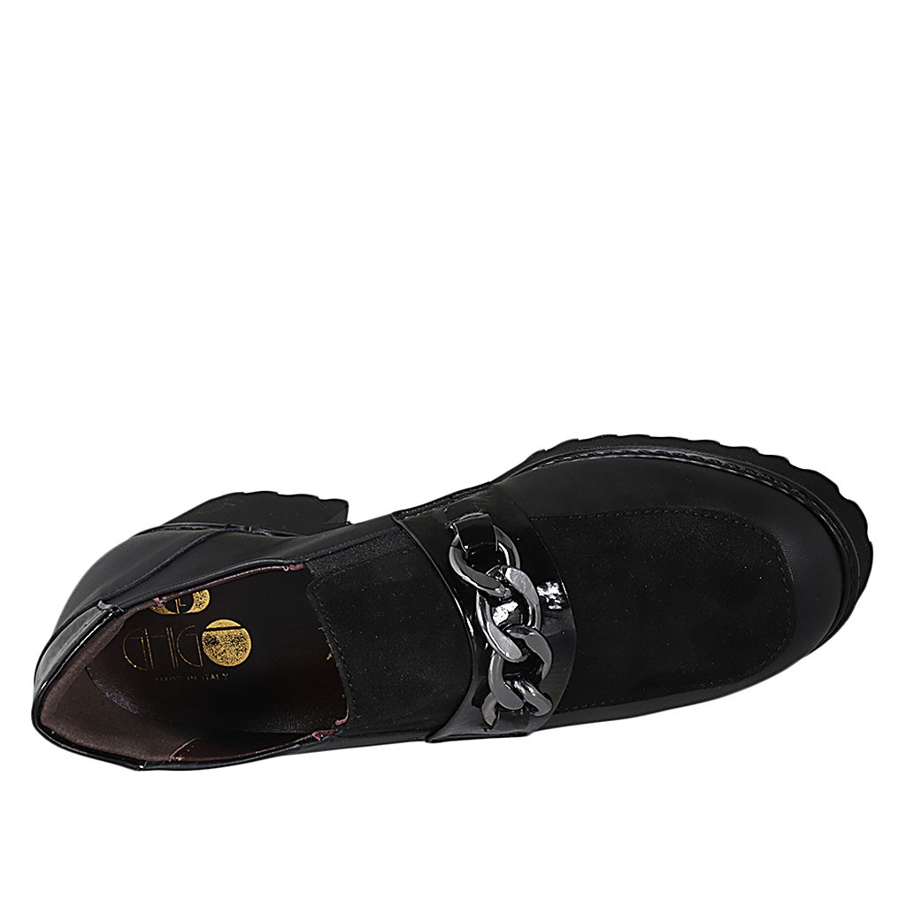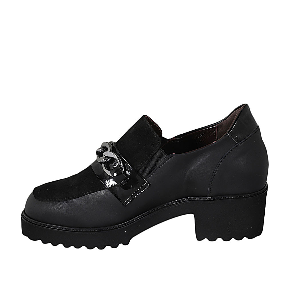 Damenmokassin mit Kette, Gummibändern und abnehmbarer Innensohle aus schwarzem Leder, Lack- und Wildleder Absatz 5