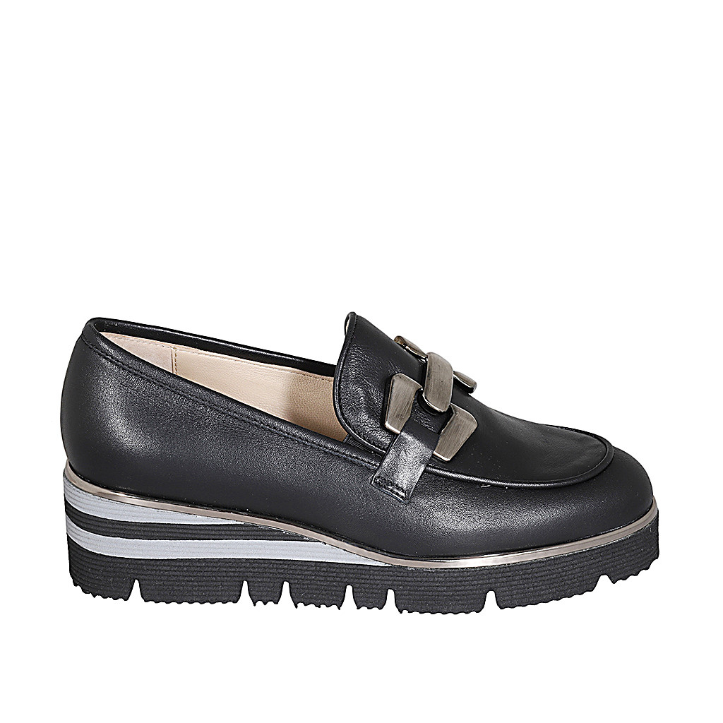 Damenmokassin mit Accessoire aus schwarzem Leder Keilabsatz 4