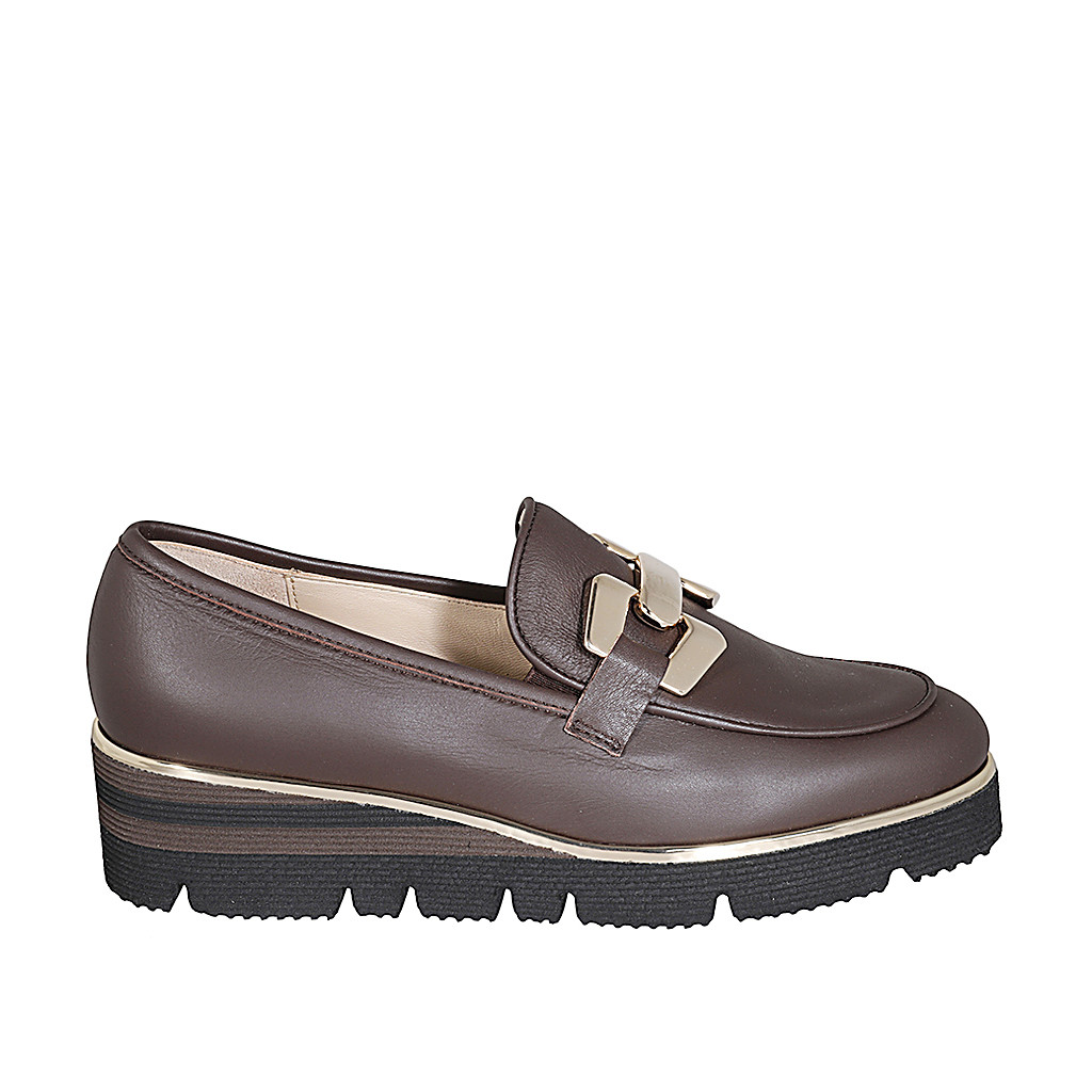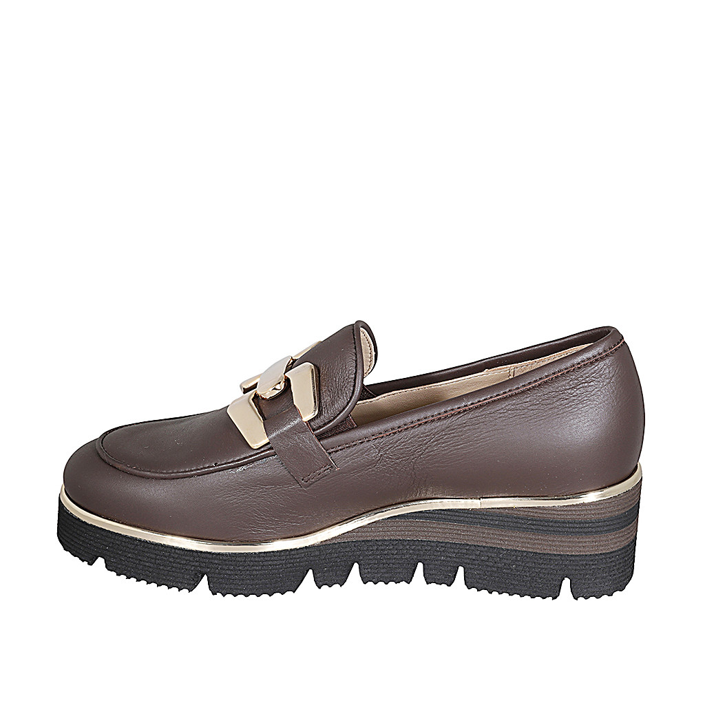 Mokassinschuh für Damen aus braunem Leder mit Accessoire Keilabsatz 4