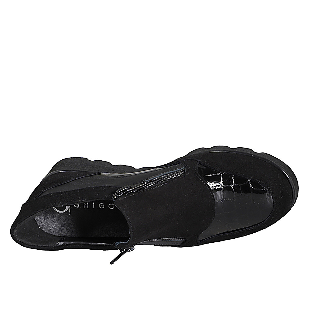 Damenschuh sneaker mit Reißverschlüssen und abnehmbarer Innensohle aus schwarzem Wildleder und bedrucktem Lackleder Keilabsatz 3
