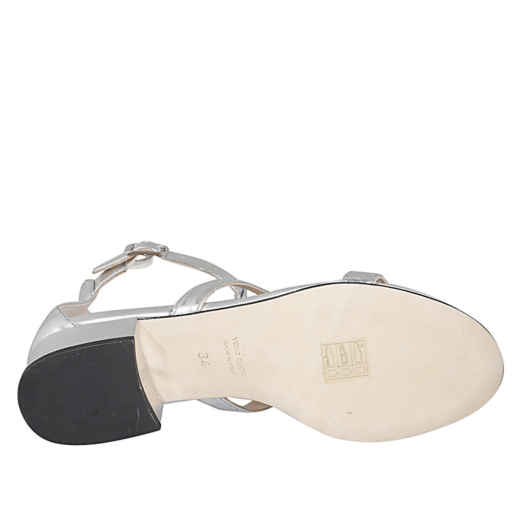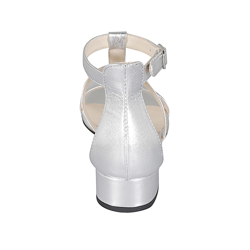 Offener Damenschuh mit Riem aus silberfarbenem laminiertem Leder Absatz 3