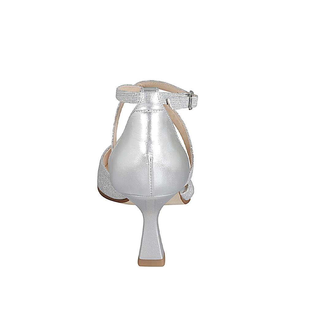 Offener spitzer Damenschuh mit gekreutzem Riem aus silberfarbenem laminiertem Leder und glitzerndem Stoff Absatz 8