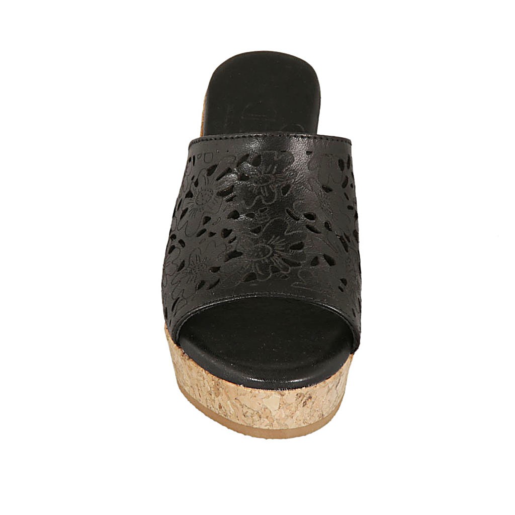 Offene Damenpantoletten aus schwarzfarbigem perforiertem Leder mit Plateau und Keilabsatz 9 - Verfügbare Größen:  42, 43, 44