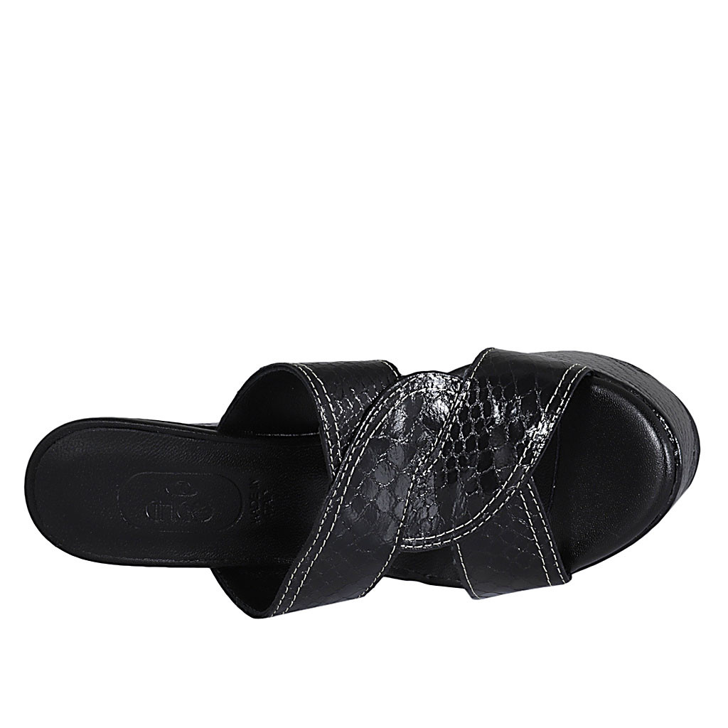 Offene Damenpantolette aus schwarzem bedrucktem Lackleder Absatz 12