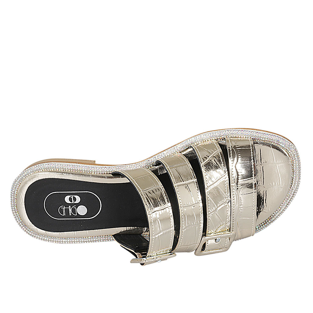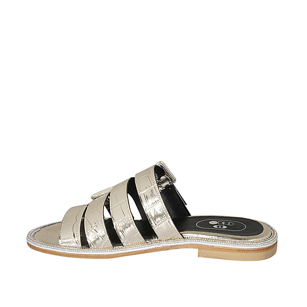 Damenpantolette mit Strasssteinen und Schnallen aus bedrucktem platinlaminiertem Lackleder Absatz 1