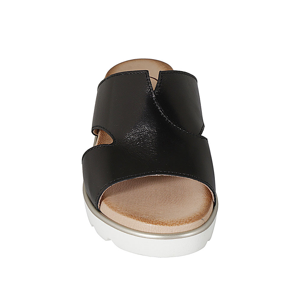 Offene Damenpantoletten aus schwarzfarbigem perforiertem Leder mit Plateau und Keilabsatz 9