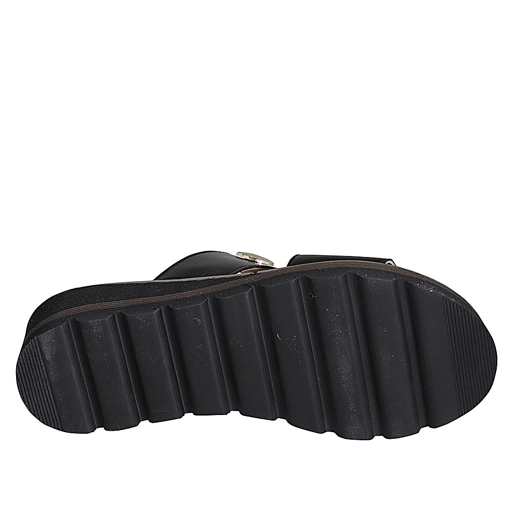 Damenpantolette mit Gummiband und Knöpfen aus schwarzem Leder Keilabsatz 4