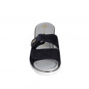 Damenpantoletten aus blauem und blaulaminiertem bedrucktem Wildleder mit Klettverschluss und Keilabsatz 4