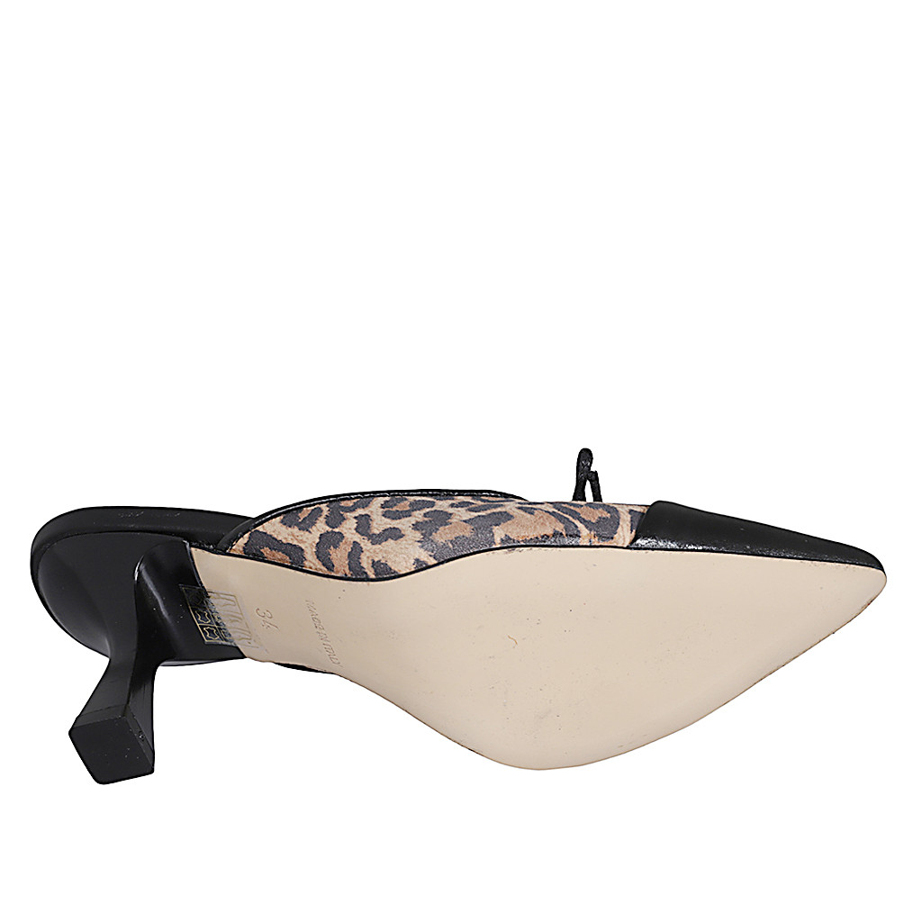 Spitze Damenpantolette mit Kappe aus schwarzem Leder, gemustertem Wildleder und Schleife Absatz 7