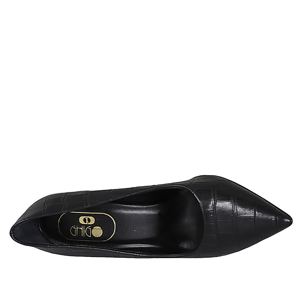 Spitzer Damenpump aus schwarzem bedrucktem Leder Absatz 9