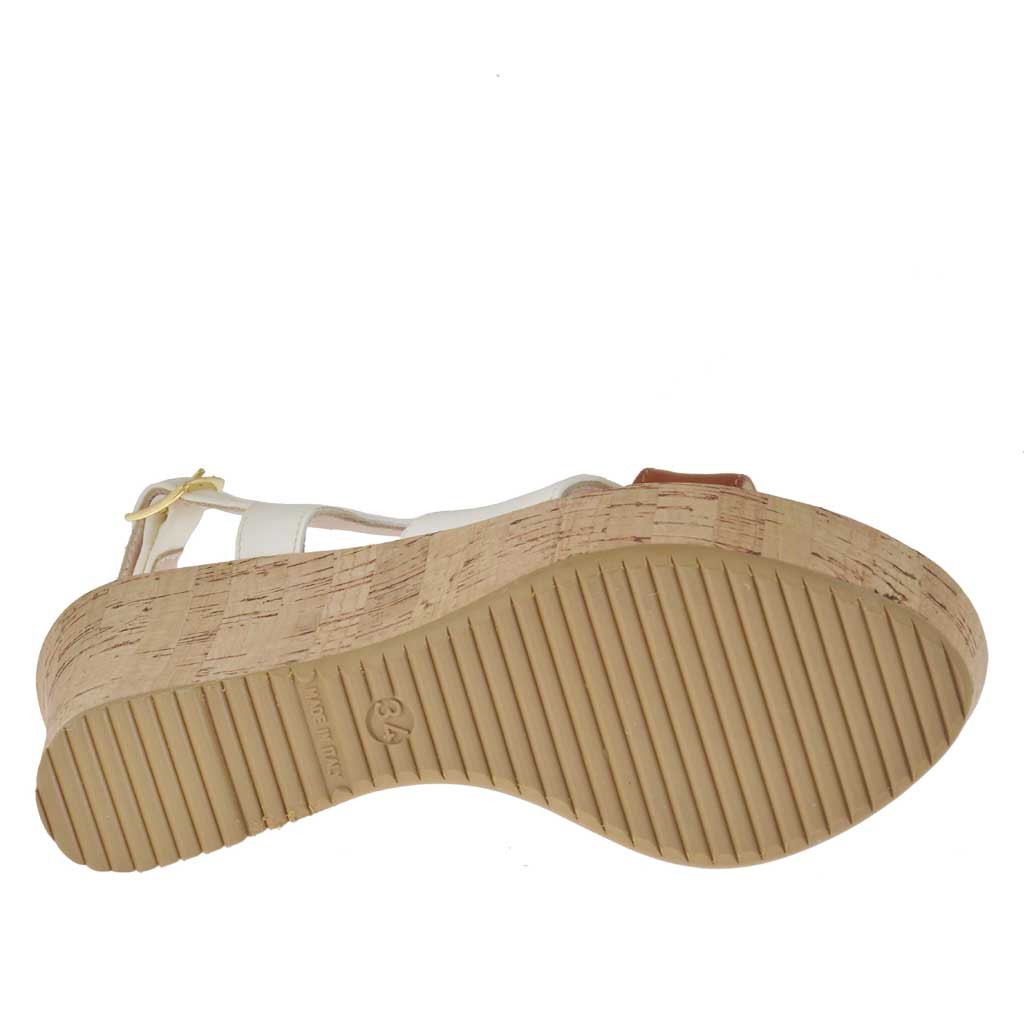 Damensandale aus weissem und lederfarbigem Leder mit Plateau und Keilabsatz aus Kork 9 - Verfügbare Größen:  42