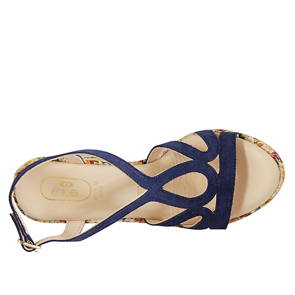 Damensandale mit Plateau aus blauem Wildleder und buntem Stoff Keilabsatz 9 - Verfügbare Größen:  33, 34, 42, 43, 44, 45