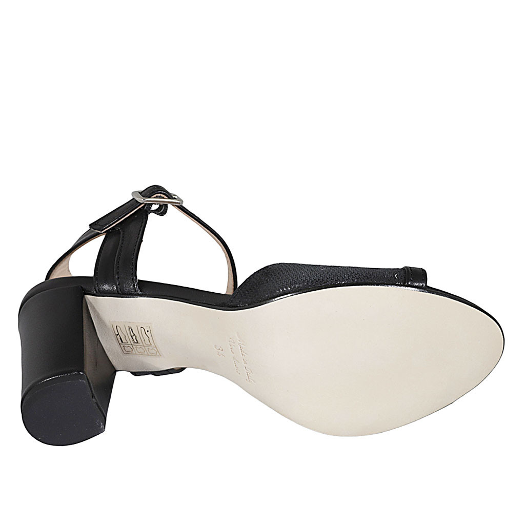 Damensandale aus schwarzem bedrucktem Lackleder mit Strasssteinen und Riem Absatz 4