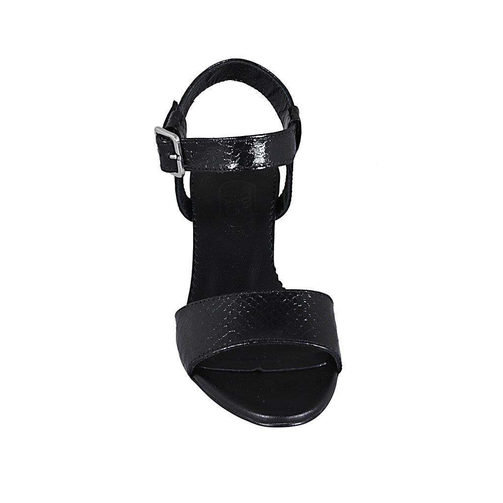 Damensandale aus schwarzem bedrucktem Lackleder mit Riem Absatz 5