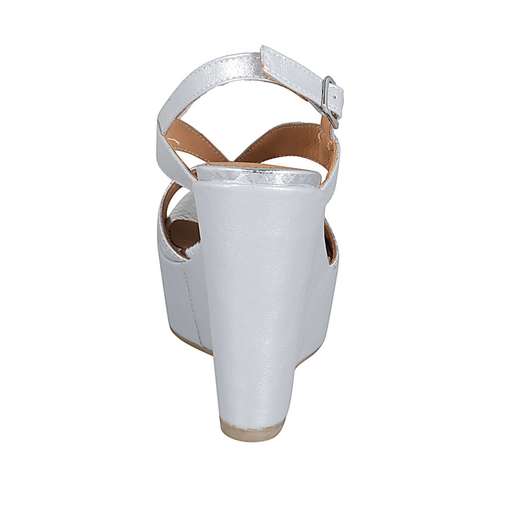 Damensandale aus silberlaminiertem bedrucktem Leder mit Plateau und Keilabsatz 12