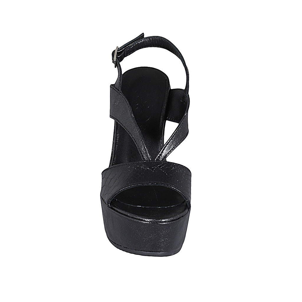Damensandale aus schwarzlaminiertem bedrucktem Leder mit Plateau und Keilabsatz 12
