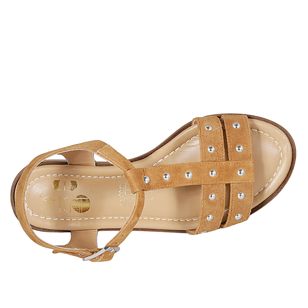 Damensandale aus cognacbraunem Wildleder mit Riem, Nieten und Absatz 1