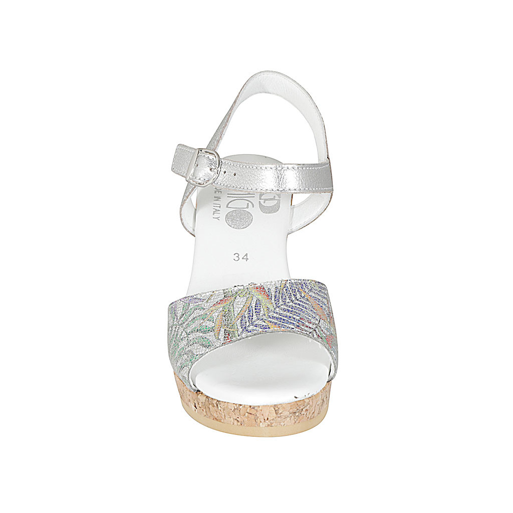 Damensandale mit Riem und Plateau aus silbernem laminiertem und mosaikbedrucktem Leder Keilabsatz 7