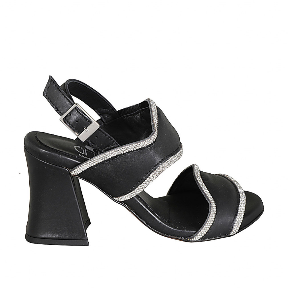 Damensandale aus schwarzem Leder mit Strasssteinen und Absatz 7