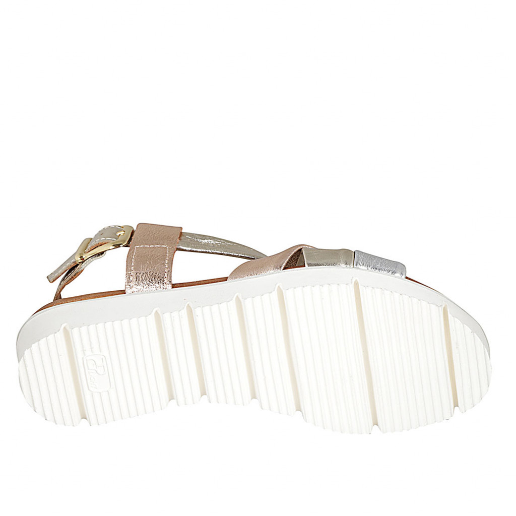 Damensandale aus platin-, silber- und kupferfarbenem laminiertem Leder Keilabsatz 3