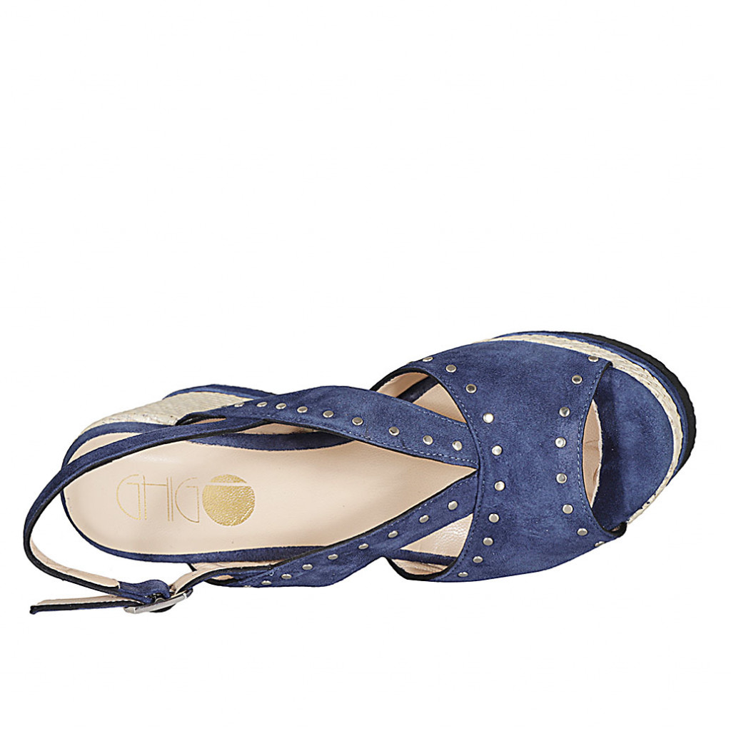 Damensandale aus blauem Wildleder mit Nieten, Plateau und Keilabsatz 7