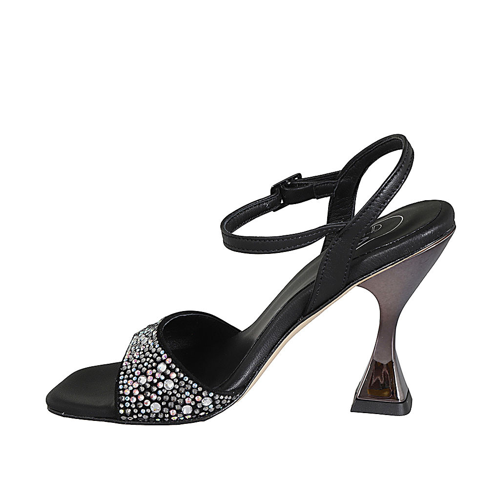 Damenriemsandale mit bunten Kristall-Strasssteinen aus schwarzem Leder Absatz 10