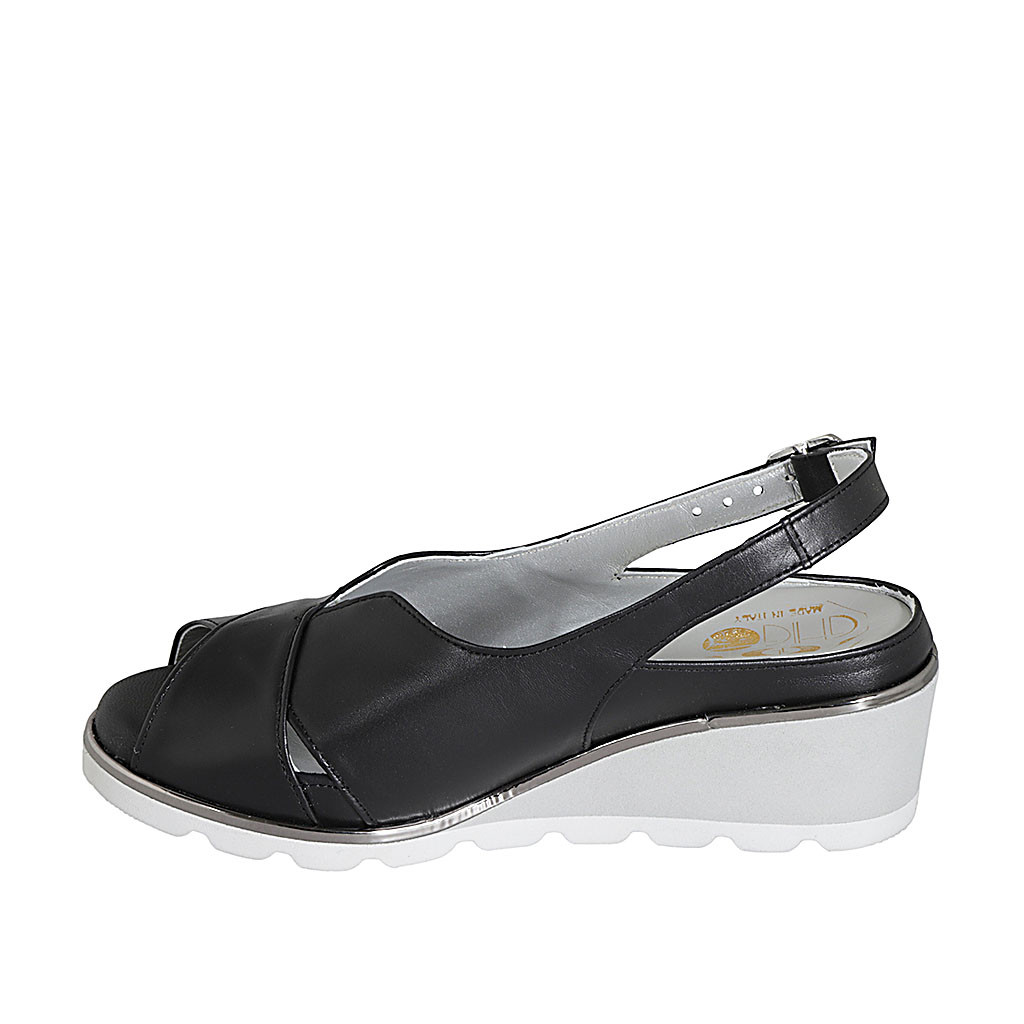 Damensandale mit herausnehmbarer Innensohle aus schwarzem Leder Keilabsatz 5