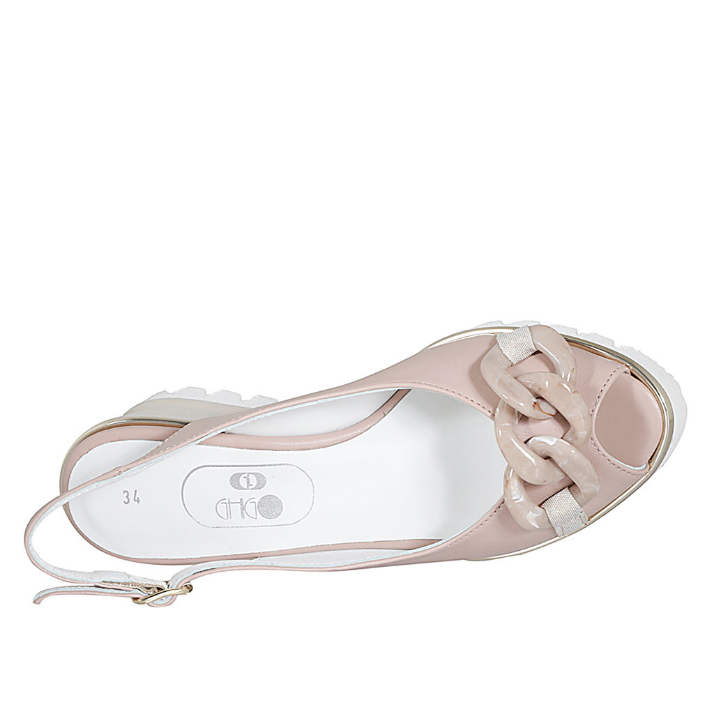 Damensandale aus hellrosafarbenem Leder mit Kette Keilabsatz 6