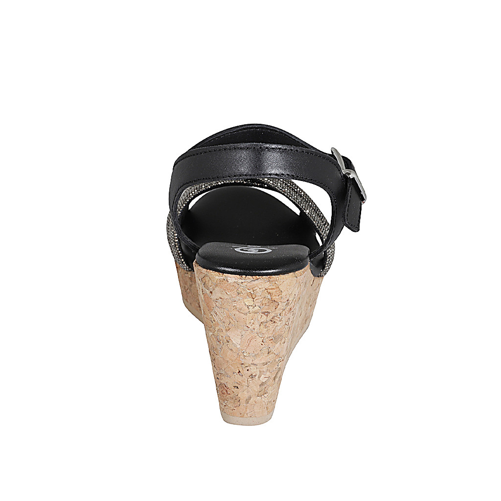 Damenriemsandale mit Plateau und Strasssteinen aus schwarzem Leder mit Keilabsatz 9