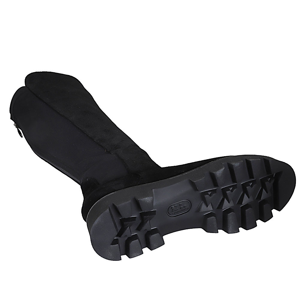 Kniehoher Damenstiefel aus schwarzem Wildleder und elastischem Stoff mit halbem und hinterem Reißverschluss Absatz 4