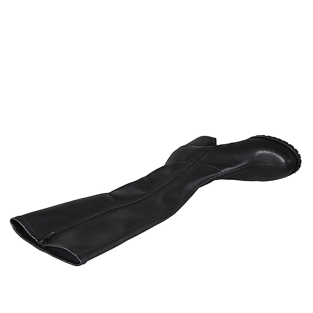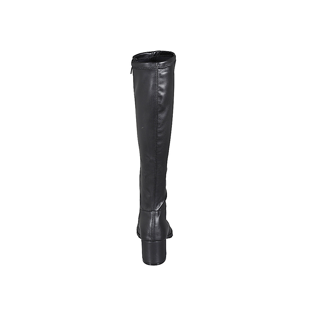 Kniehoher Damenstiefel aus schwarzem elastischem Material und Leder und Reißverschluss Absatz 6