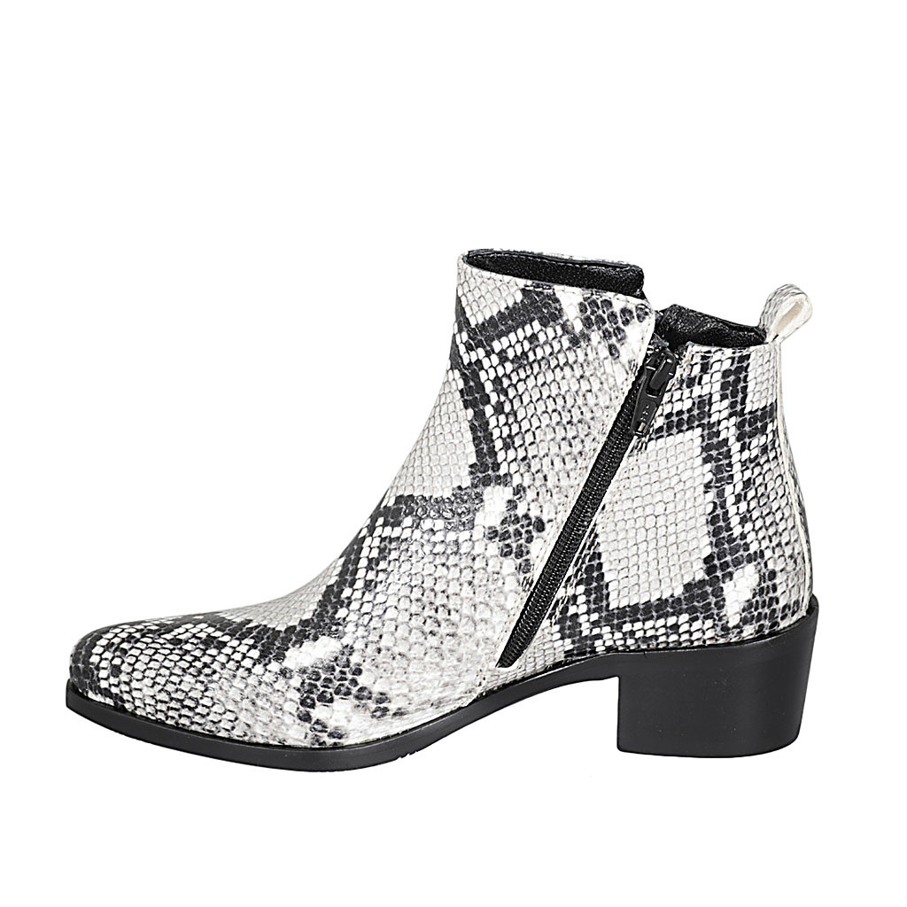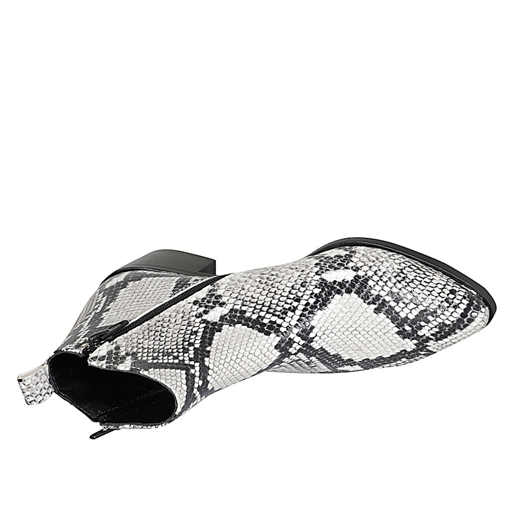 Spitze texanische Damenstiefelette mit Reißverschlüssen aus schwarzem und weißem bedrucktem Leder Absatz 4