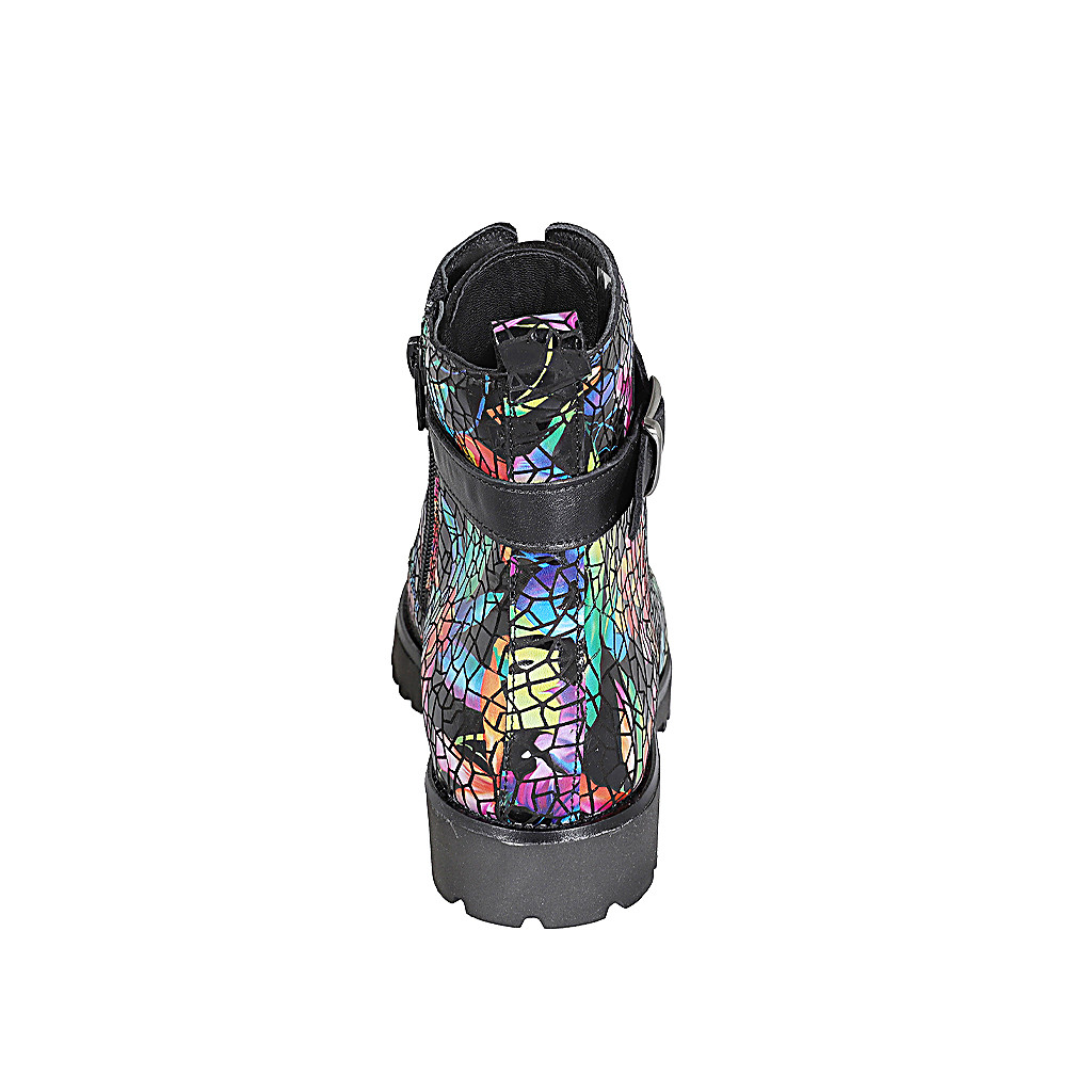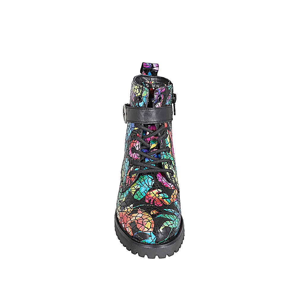 Damenstiefelette mit Schnürsenkeln, Schnalle und Reißverschluss aus schwarzem und buntbedrucktem Leder Absatz 5