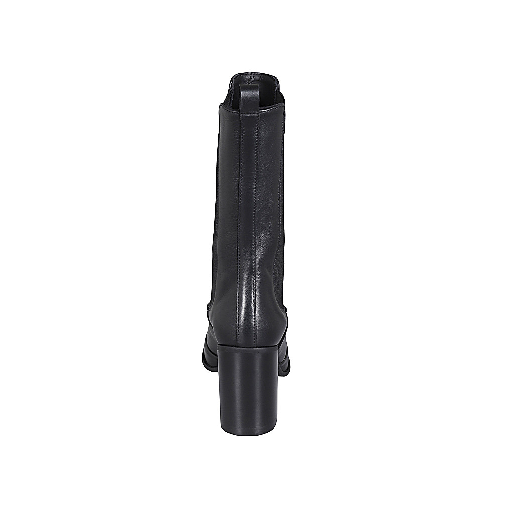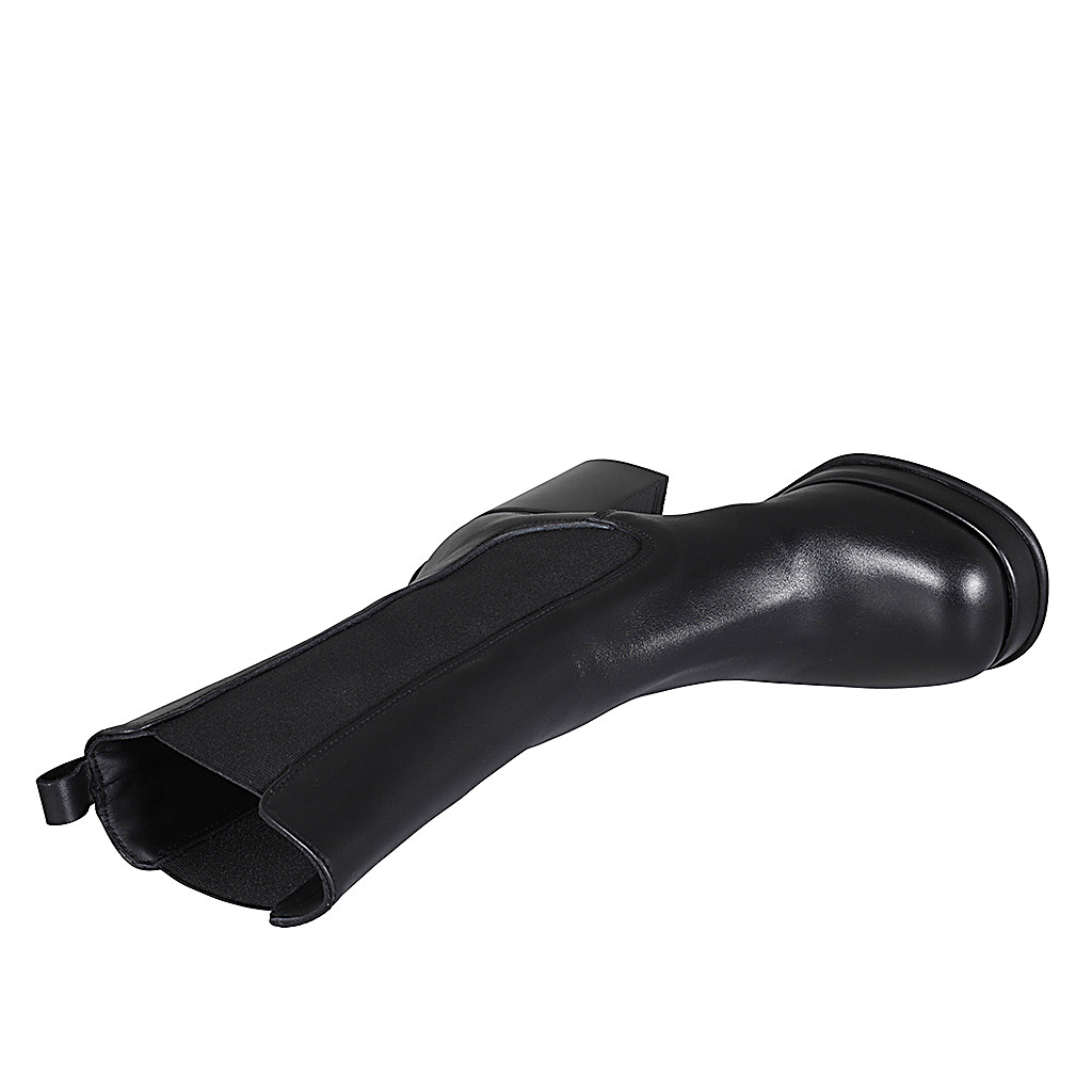 Damenstiefelette mit Reiβverschluss aus schwarzem bedrucktem Wildleder und Lackleder Absatz 9