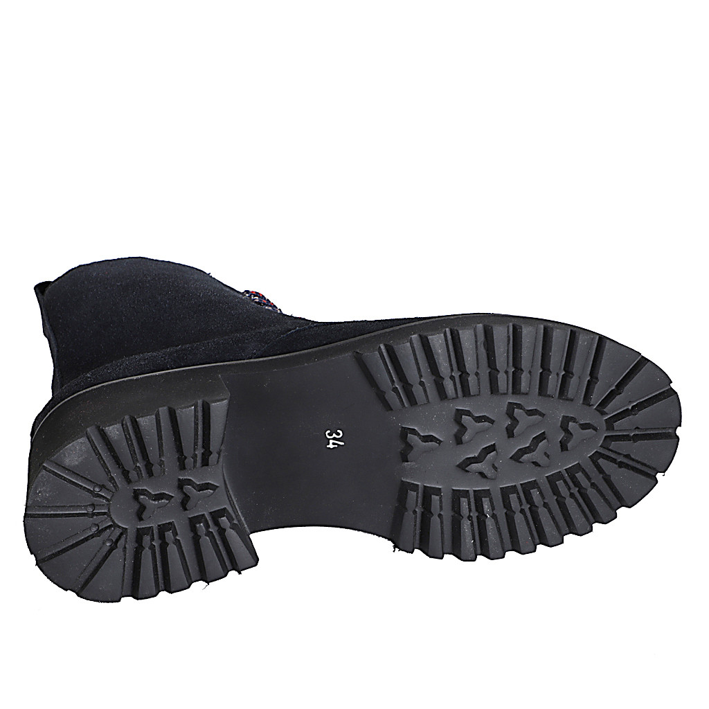Damenstiefelette mit Reiβverschluss und Schnalle aus schwarzem und goldenem gemustertem Wildleder...