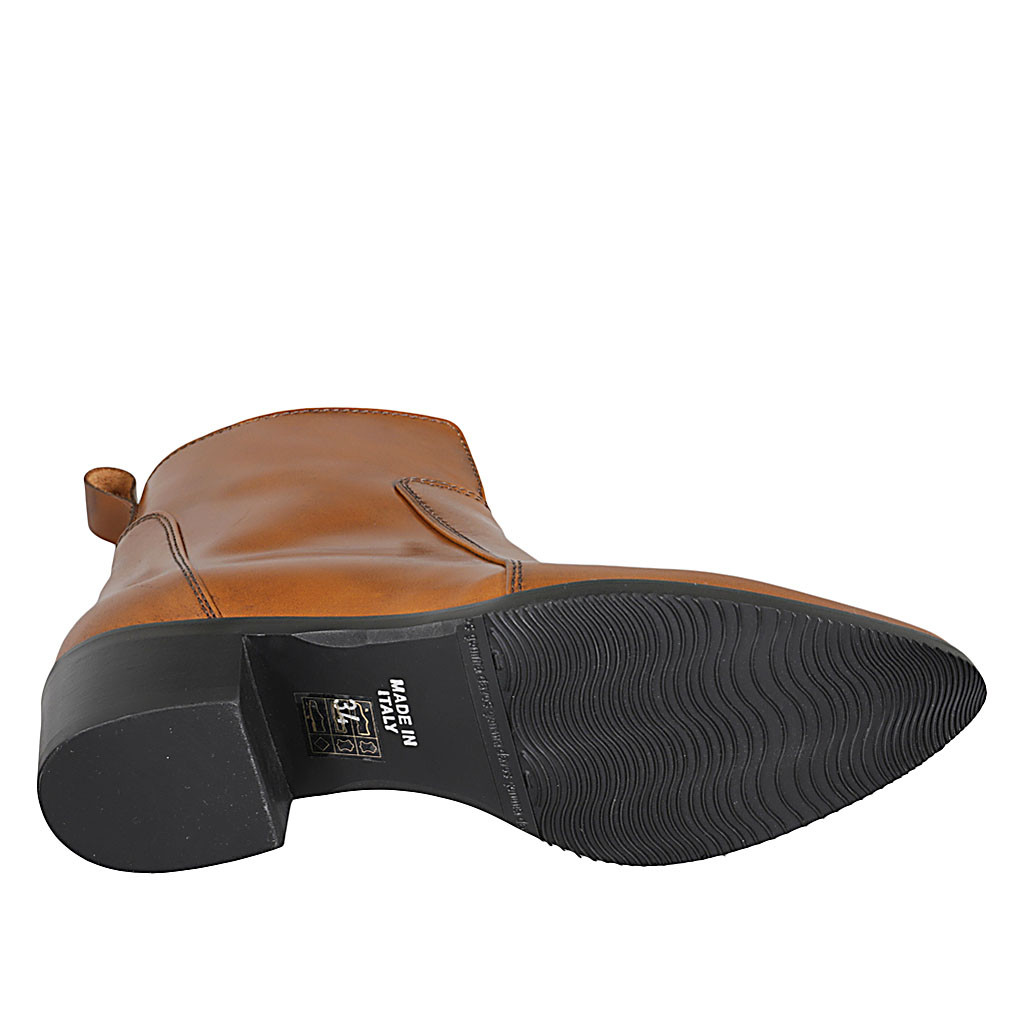 Woman's Texan ankle boot with zipper in cognac brown leather heel 4
