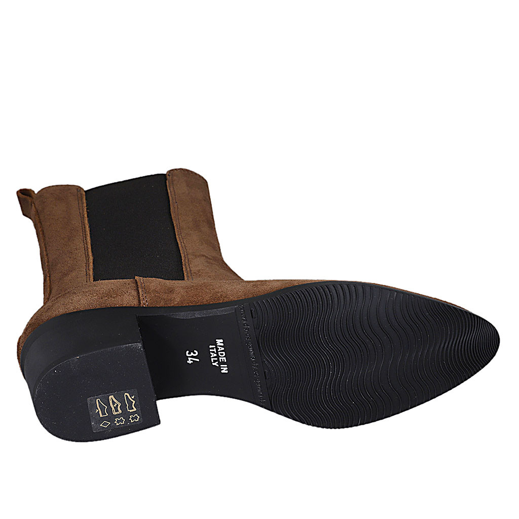 Woman's high and pointy ankle boot with elastic bands in cognac brown suede heel 5 - Available sizes:  44